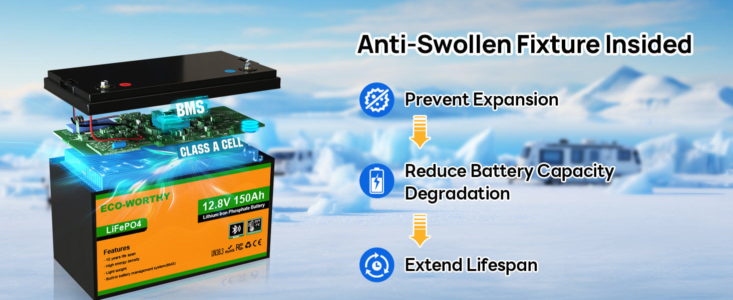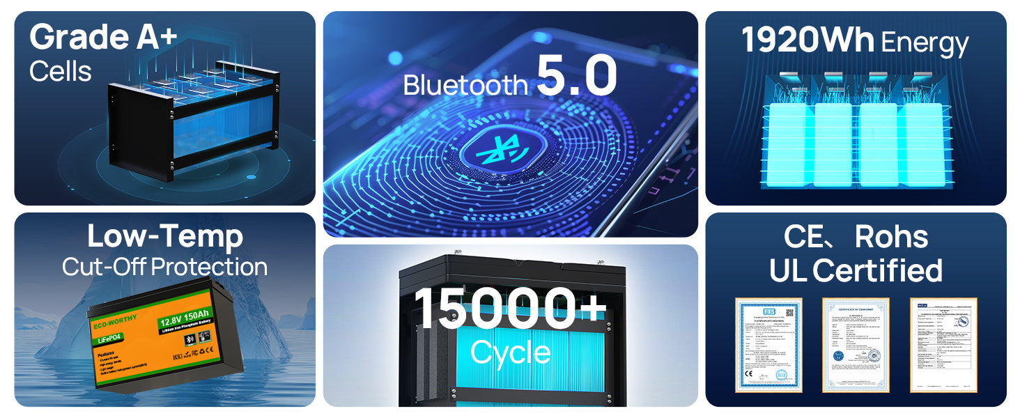 [150A BMS, Grade-A Cell] ECO-WORTHY 150Ah Battery is manufactured with automotive grade lithium iron phosphate cells, which offers higher energy density, more stable performance and greater power. The cells inside the battery are UL,IEC tested and CE,RoHS certified, providing the highest level of safety for you. It also has a built-in 150A BMS to protect the battery from overcharge, over temperature, over discharge, over current, low temperature and short circuit.