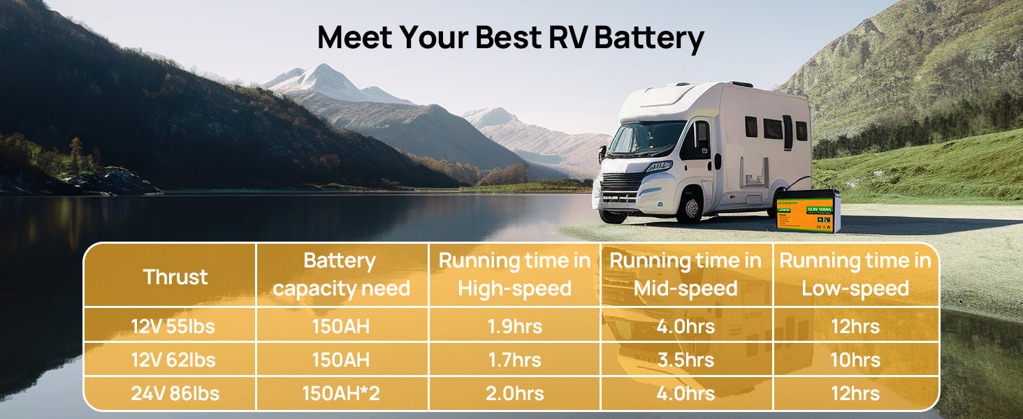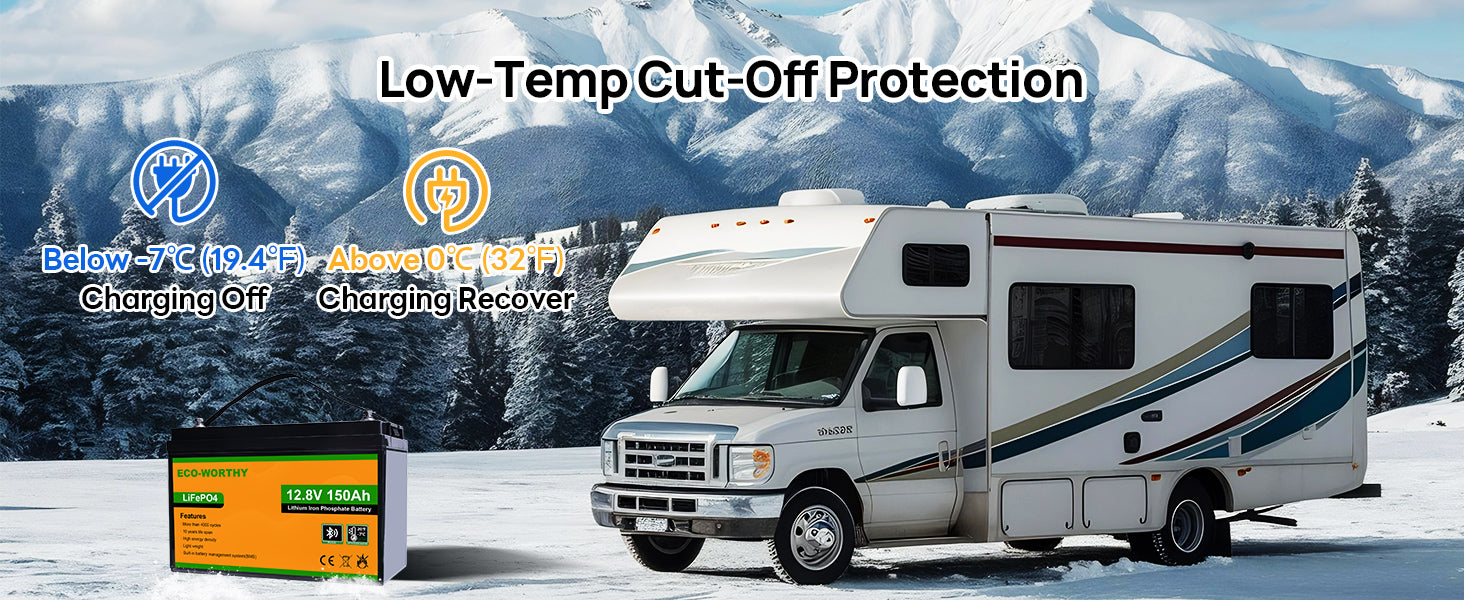 [Low-Temp Protection] This 12V 150Ah lithium trolling motor battery is equipped with low-temperature cut-off protection which automatically cuts off the battery from charging when the cell temperature is below -7℃(19.4℉) to prevent the battery cells from being damaged. Especially designed to ensure safe use for the low temperature charging environment in winter. Widely used for RV, cabin, off-grid or marine in cold winter.