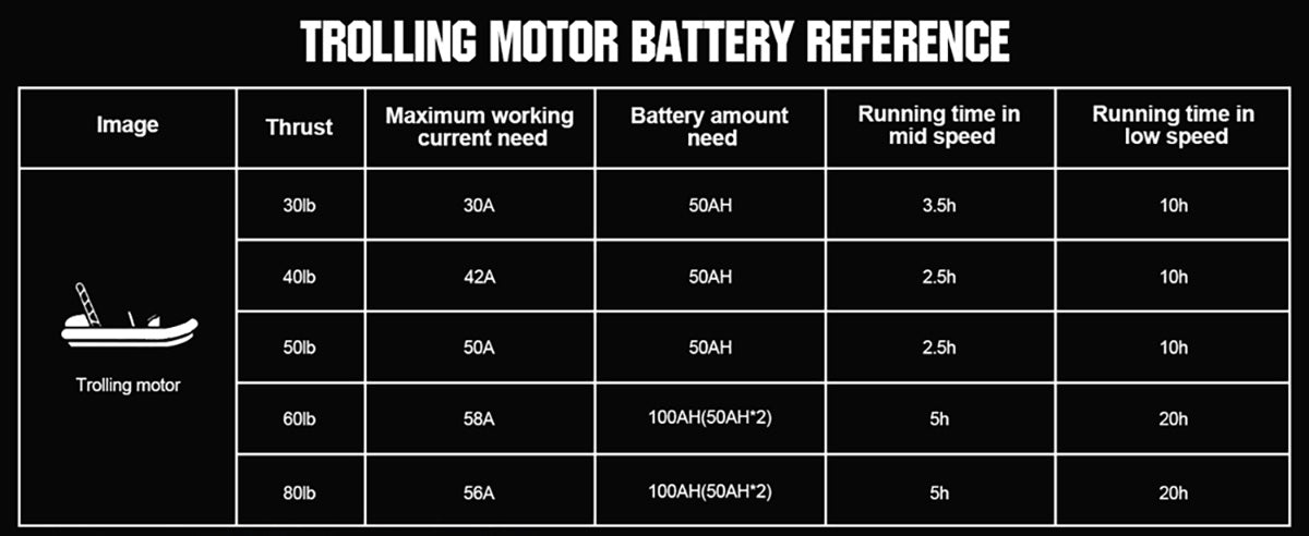 J'ai acheté une batterie de 50 A. pour mon moteur électrique. Depuis l'achat en juin, je l'ai utilisée et rechargée 3 fois. Jusqu'à maintenant tout va bien. En 4 hrs de pêche avec un canot, j'ai utilisé environ 50% de la charge.