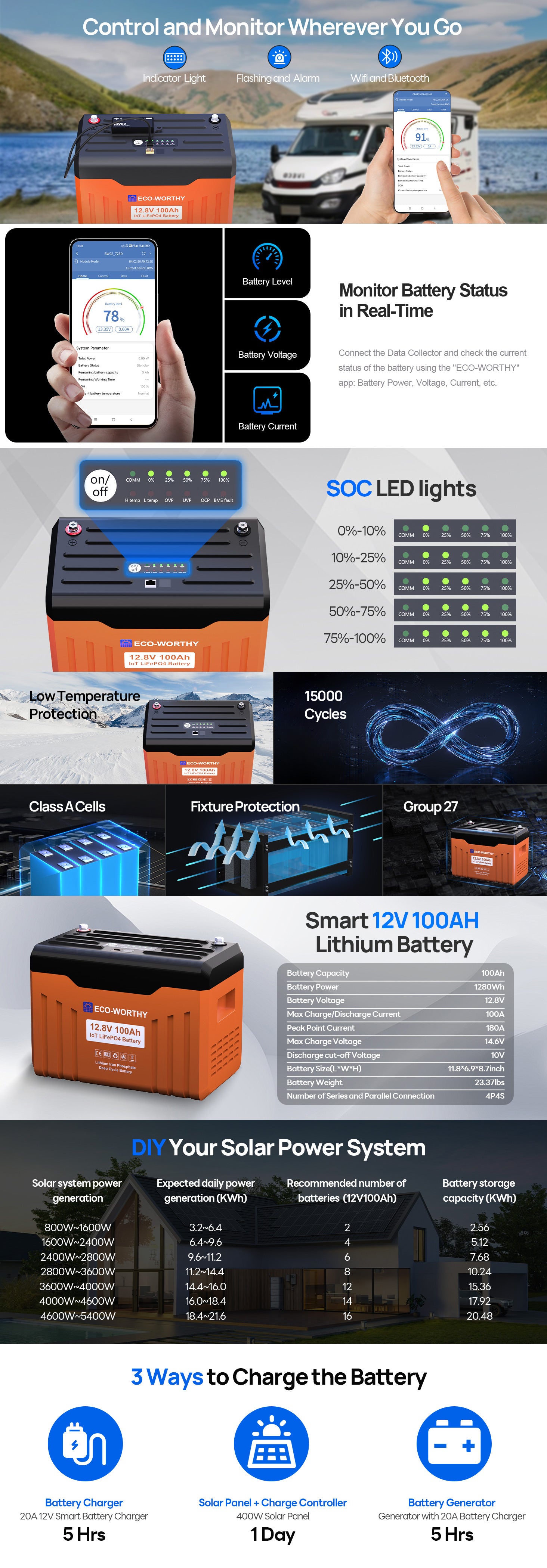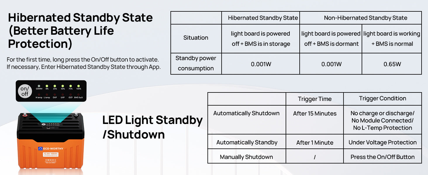 【Low-Temperature Charging Protection】The ECO-WORTHY 12V 100Ah LiFePO4 lithium battery includes low-temperature cut-off protection, automatically disconnecting charging below -7°C (19.4°F). This protects the battery cells from damage, making it ideal for safe and reliable use in cold weather RV, cabin, and off-grid applications.