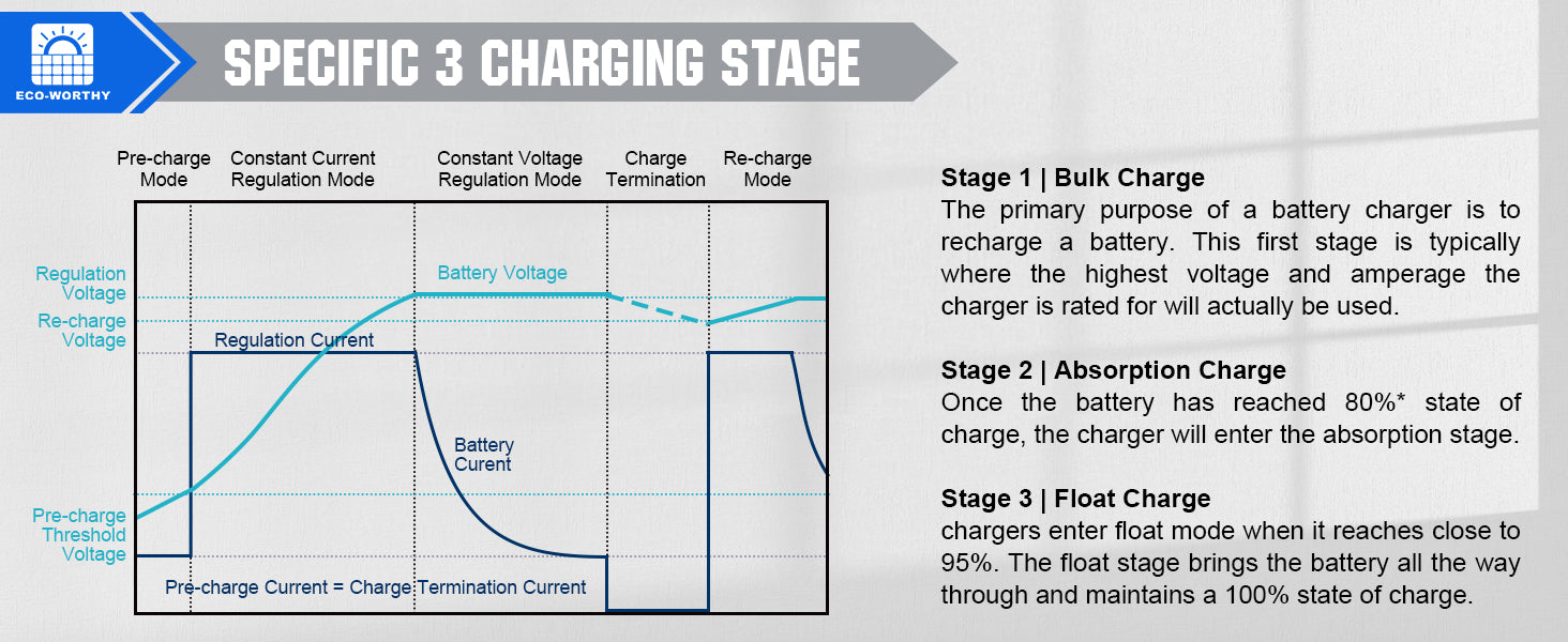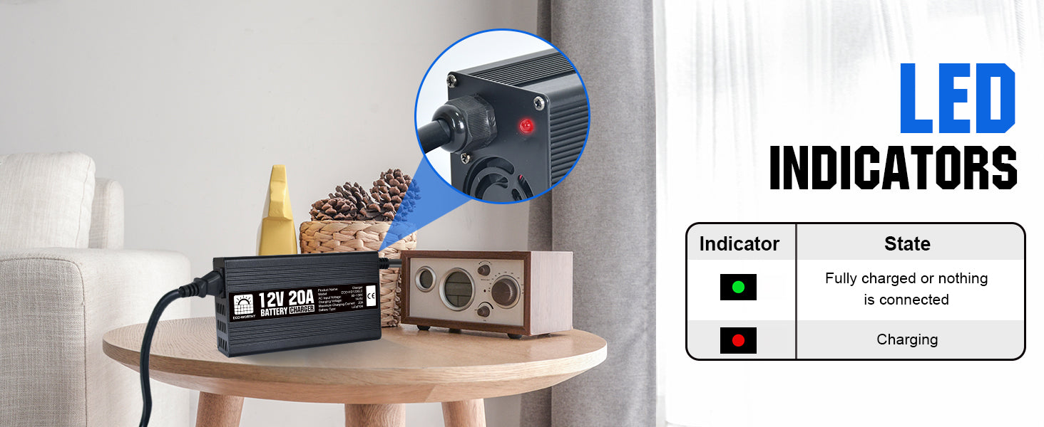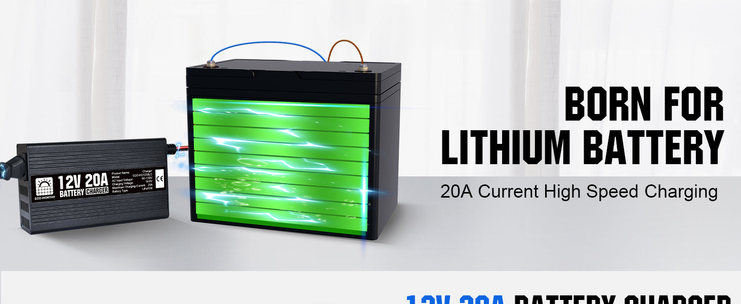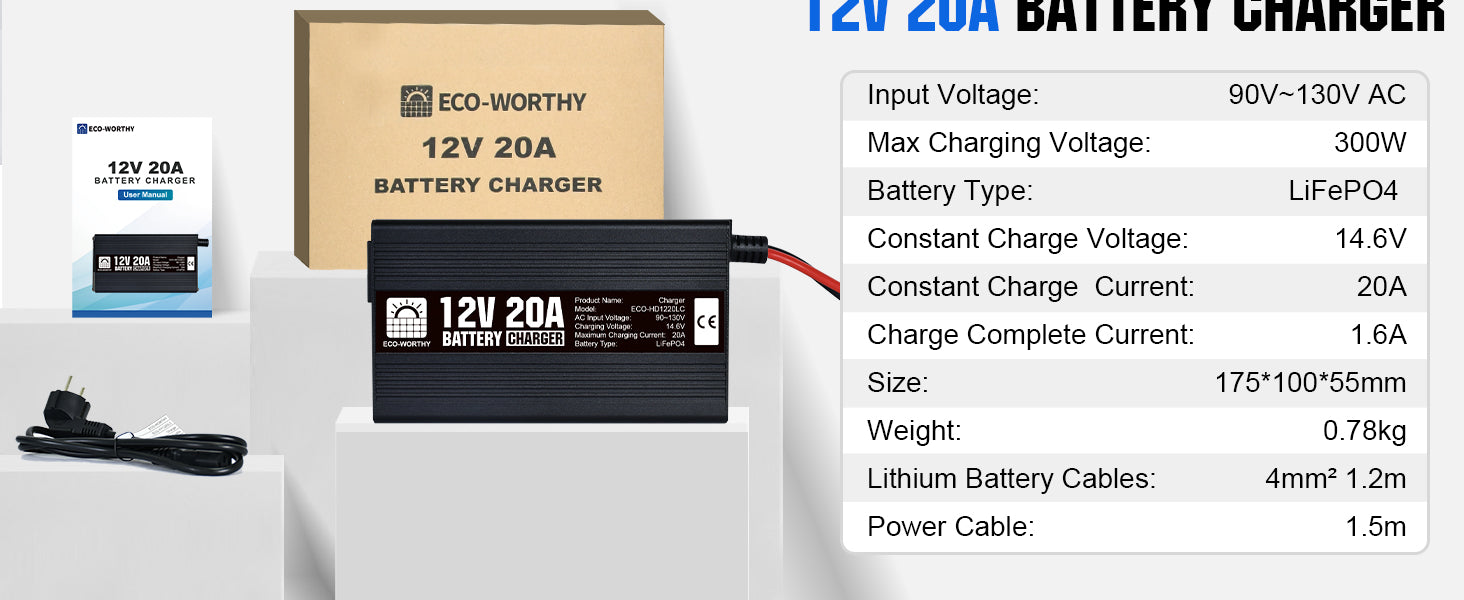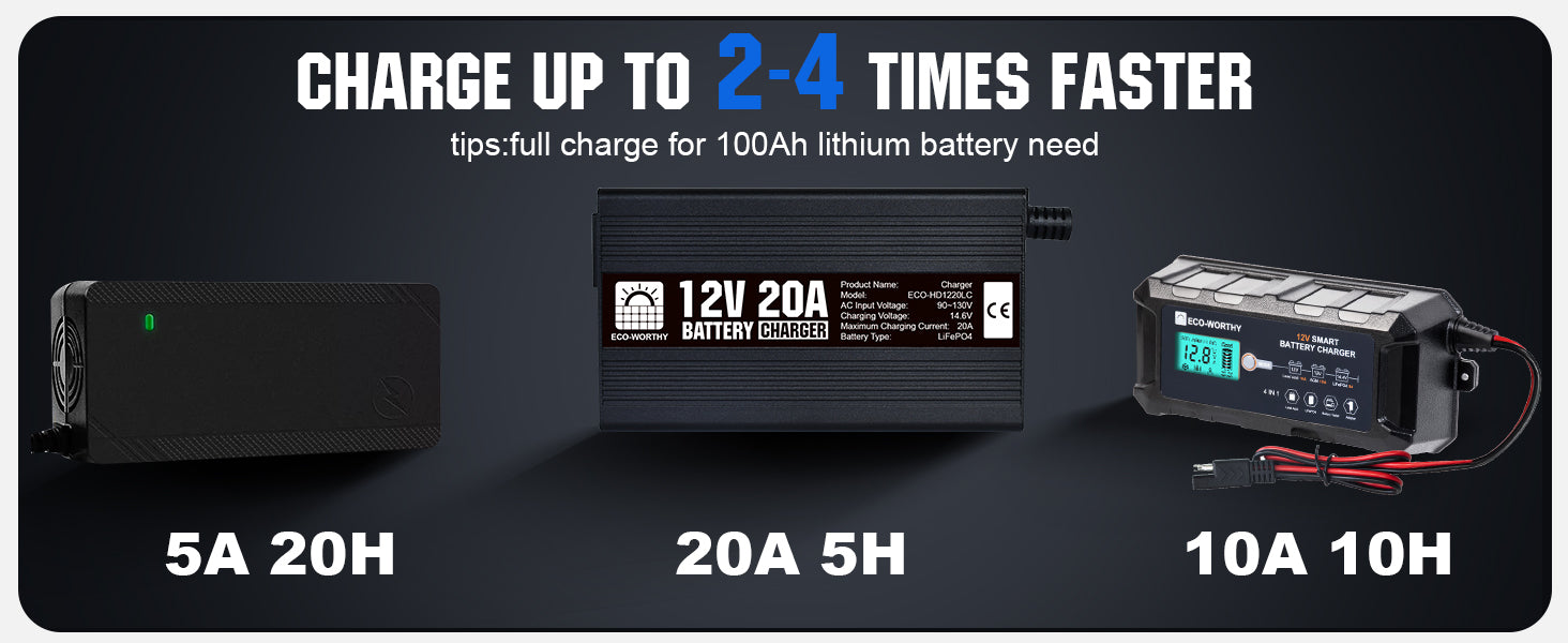 ·Fast Charging Speed: With a constant voltage of 14.6V, with a maximum current of 20A. it can charge a 12V 100Ah LiFePO4 battery to 50% in 2.5 hours, 2 times faster than an ordinary 10A battery charger.