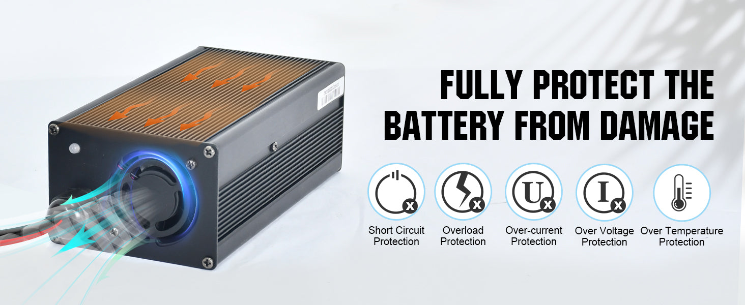 ·Multiple Protections: This smart charger provides multiple protections to prevent over voltage, over current, short circuit, and overheat. It has full charged auto stop function and 0V charging mode. When the LiFePO4 battery is being protected by BMS, the charger can reactivate the battery and restore the normal voltage.
