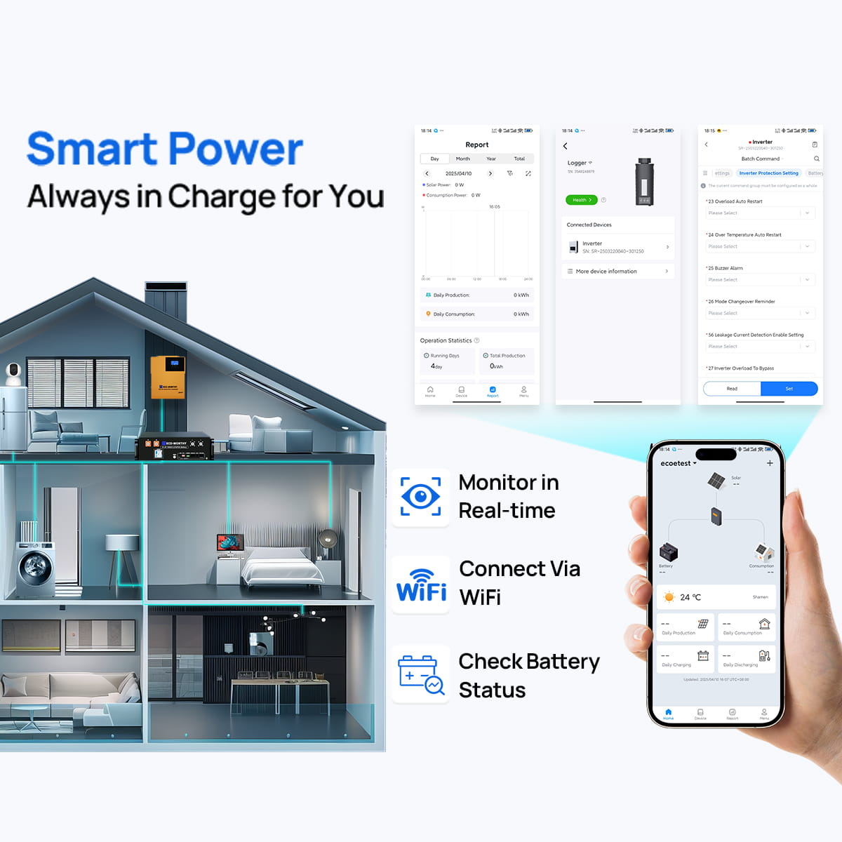 [Intelligent monitoring complementarity] Both the battery and the inverter have Integrated Bluetooth, WiFi, and RS485/CAN communication protocols enabling remote monitoring and control for enhanced system management and troubleshooting.