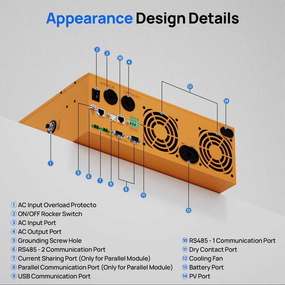 [Applicable to multiple power inputs]The inverter supports multiple inputs of solar energy, generators and city power. Combined with battery energy storage, it builds a flexible off-grid or hybrid power system to improve energy efficiency and power supply reliability.