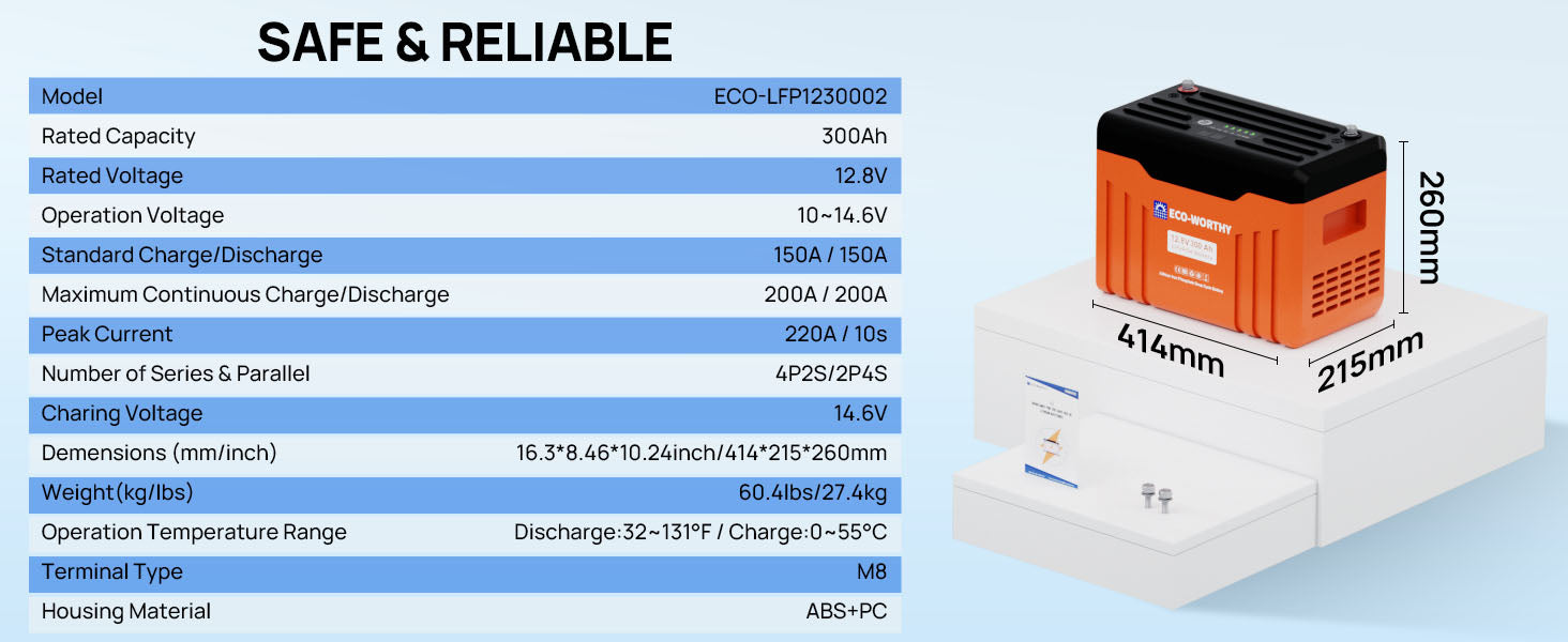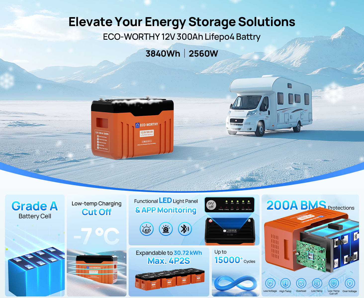 【Easy Troubleshooting & Scalable Power】The ECO-WORTHY 12V 300Ah battery makes troubleshooting a breeze! A built-in buzzing alarm alerts you to potential issues, while the ECO-WORTHY app helps you quickly diagnose and resolve problems. Plus, expand your power by connecting up to 2P4S or 4P2S.