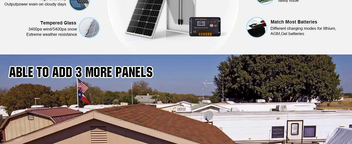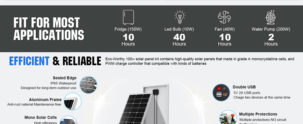 ECO-WORTHY 100W 200W 12V Solar Kit can be used for several different purposes, including cottages, weekends, cabins, boats, RVs, Campers, etc. Whatever the kit is used for, you can rest assured that you are purchasing a quality system. Run a small stereo, laptop computer, cell phone charger, lights or TV. These size systems need conscious conservation of energy. If you have any questions regarding this product, please contact us info@eco-worthy.com.